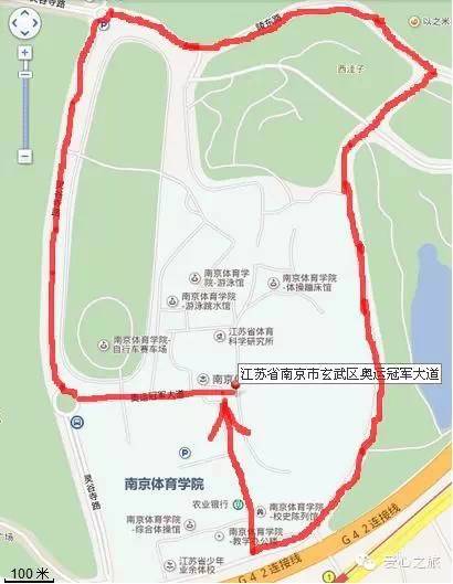 从南京体育学院中央体育场西司令台出发,经冠军大道,出学校西门进入灵谷寺路,向灵谷寺方向直走。岔路口右转进入陵东路,直走。第二个路口右转进入体育公园路,沿路右转到达学校南门,回到终点。