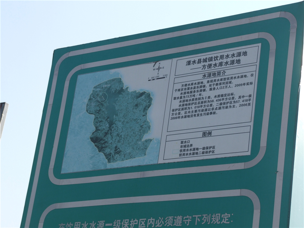 网络资料: 建于 1958 年的方便水库,又名“东屏湖”,位于秦淮河支流──二干河的上游,是一座集防洪、供水、灌溉、观光、增殖于一体的中型水库,水质常年达国家地表水Ⅲ类标准以上。总库容南京市境内第二,溧水区境内第一。水域面积 6.8 平方公里,库容 5070 万立方米,大坝长 1077 米,高 14.5 米,顶宽 5.5 米。建有溢洪闸、灌溉涵洞。库西北有非常溢洪道。以防洪、灌溉为主。灌溉面积 0.33 万公顷。